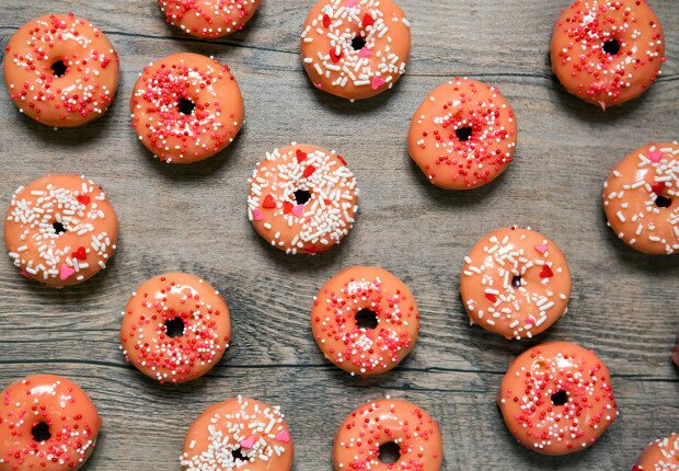 Have you ever used rose water in your baking or cooking? It’s beautifully floral, but the key is to use only a small amount, because too much can make your food taste like perfume (much like cooking with lavender), which we, obviously, don’t want. I love, love, love it in these mini donuts. It gives them a unique and ever-so-dainty flavor of roses—perfect for Valentine’s Day!