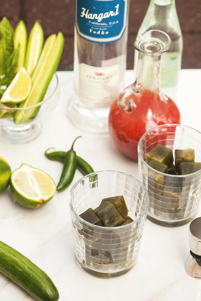 - Fill the glass with your green ice cubes. Pour in 2 ounces Hangar 1 Straight Vodka, 2 ounces of tomato juice, and fill the remainder of the glass with the cucumber soda.