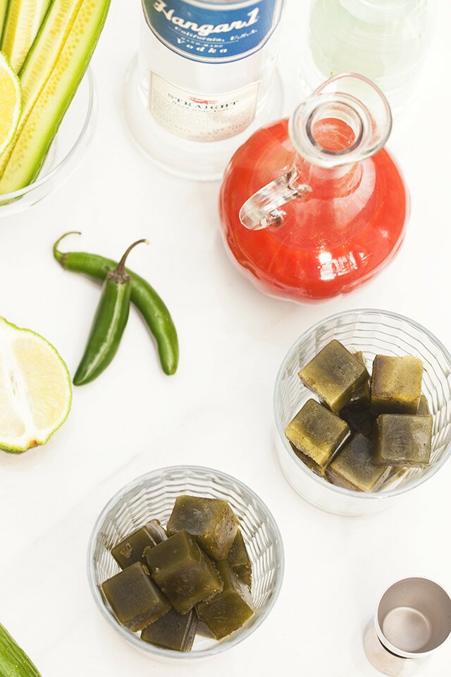 And how about those green ice cubes? Not only are those jewel-toned cubes pretty to look at, but your drink won’t get watered down as they melt! In fact, your drink will get spicier as they melt, thanks to the Serrano chile! It’s the little things that make all the difference, ya know? I made itty-bitty cubes, and a few giant cubes. I totally can’t decide which I like better.
