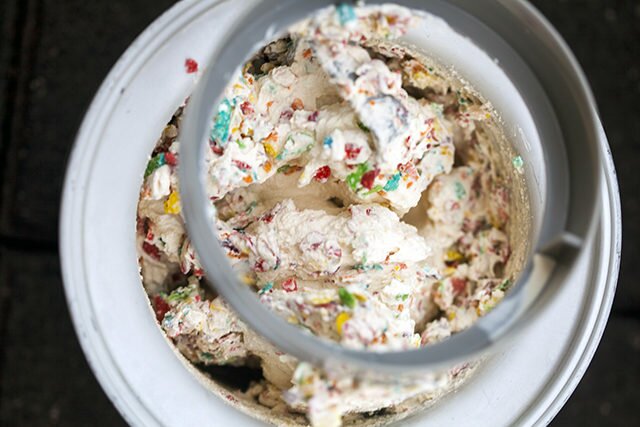 Yes, that is Fruity Pebbles ice cream. It even looks amazing! I went through the trouble of infusing milk with fruity pebbles and straining it, making a beautiful custard base… Guess what? Terrible. Even if you add the Fruity Pebbles in at the end of churning, after it sets up in the freezer, they get soggy as hell. Not a great texture in the least.