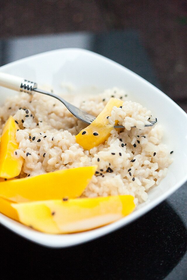 I chose to garnish my sticky rice with black sesame for a tiny bit of crunch, and contrasting color, but something like toasted coconut would also be lovely.
